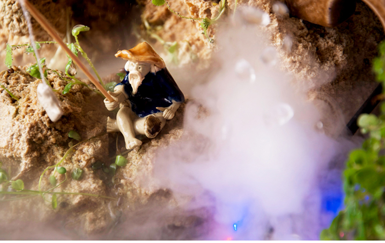 在此基础上,还可在上水石适合的位置处制成球面凹坑,其上置一球。如此一来,当接通彩色雾化灯和流水装置的电源时,从上水石的顶部边缘流下的水流形成多层流水瀑布,不断变换的彩光透过流水瀑布散射开来,所置采球缓缓转动,给人带来梦幻般的视觉享受,更美化了人们的生活。